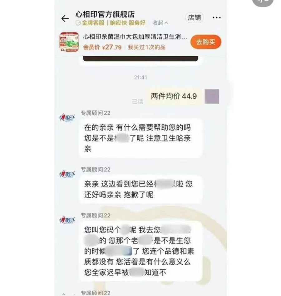 此前一天,有网友在社交平台爆料称,自己在某电商平台心相印官方旗舰店购物咨询时,遭客服人员恶意辱骂。